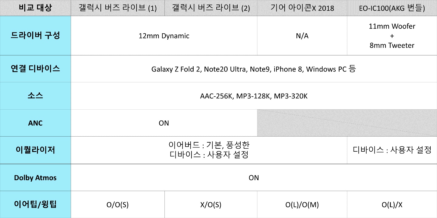 사용 후기 [리뷰] 갤럭시 버즈 라이브 상세 사용기 작성자 : 마일로스 작성일 : 2020. 12. 24. 12:25 안녕하세요. 마일로스입니다. 버즈 라이브를 얻어서 사용한지 3달이 넘었습니다. 사용하면서 느낀 점을 정리해 조금 긴 상세 리뷰를 적어봤습니다. 원래 A4 10장이 넘는 분량이 나왔는데..줄인다고 줄였는데도 아래 글 정도가 나왔네요. 8월 출시 이후 꽤 긴 시간이 지났고, 조만간 버즈 프로(?)가 나올 시점에 리뷰를 적어봅니다. 아직 라이브를 찾으시는 분들도 많더라고요. 읽고 많은 도움 되셨으면 좋겠습니다. 디자인 디자인 때문에 많이 당황하셨죠? 코드네임인 ‘Bean’ 에 걸맞는 콩 모양 디자인입니다. 강낭콩에다 광택 씌우고 섞어놓으면 진짜 찾기 힘들지도 모르겠어요. 유닛 자체가 조금 큰 편. 삼성 코드리스 이어폰 시리즈 중 최초의 오픈형 입니다. 버즈 플러스와는 많이 다른 모양새죠. 덕분에 호불호가 좀 많이 갈릴 것 같아요. 오픈형이 다 그래서... 삼성이 처음 오픈형을 만든 것은 아니에요. 2016년에 공개된 ‘인 이어 핏’ 이 있죠. 그땐 애플의 이어팟과 같은 ‘세미 오픈형’ 디자인이었다면 이번 버즈 라이브는 완벽한 오픈형 디자인입니다. 사람들이 생각했던 것과는 뭔가 많이 달라서 당황스러우실 수 있겠지만 얘도 보다보면 뭔가 적응은 되네요. 외부며 내부며 할 거 없이 뭔가 구멍이 많습니다. 다행히 이 구멍들이 이유없이 있는 건 하나도 없다는 점. 모두 각자의 기능을 잘 수행하기 위해 있어요. 유출부터 말이 많았는데 실물이 생각보다 괜찮더라고요. 유광인데, 처리가 깔끔해서 그런지 매끈매끈한게 보기 좋습니다. 근데 좀 튀기는 해요. 마치 버즈 플러스 BTS 에디션 처럼. 케이스는 브론즈 색상만 무광(헤이즈 디자인)이고 나머진 유닛과 같은 유광인데, 네모 둥글한 케이스도 예쁩니다. 주머니에 넣어도 부담스럽지 않을 정도라 마음에 들어요. 하드웨어 오픈형의 장점도 살리면서 단점을 완화시키기 위해선 하드웨어가 상당히 중요한 역할을 하게 됩니다. 기존 버즈 플러스에 다이내믹 2-Way 드라이버가 적용되면서 꽤 호평을 받았었죠. 하지만 유닛이 납작해지면서 한 세대 만에 다시 빠졌습니다. 대신 기존 6mm에서 두 배 커진 12mm 드라이버가 탑재되었어요. 거기에다 중저음을 강화하기 위해 베이스 덕트도 탑재되었고요. 뒤에서 설명하겠지만 개선이라고 봐도 되는 부분. 이 외의 하드웨어는 버즈 플러스와 비슷한 구성입니다. 내부 1개, 외부에 2개가 있는 마이크도 기존보다 커졌어요. 자이로 센서, 그립 센서, IR 센서 등 기존엔 없던 센서도 새로 추가되었고요. IR 센서는 기존에 탑재하던 착용 감지 센서를 대체하기 위해 탑재되었습니다. 터치패드가 없는 것처럼 보이는데 여전히 존재해요. 더 잘 인식되기도 하고요. 이번에도 내장 메모리는 없습니다. 아이콘X 아직까지 들고있는 이유가 내장 메모리 때문인데..케이스 이정도로 넓어졌으면 넣어줄 수 있지 않을까 생각해봐요. 2~3만원 더 주더라도 메모리 있는게 더 좋지 않을까 라는 생각. 사운드 성능 위의 환경에서 위와 같은 음악들을 들어봤습니다. 잘 만들어진 이어폰이라고 보시면 됩니다. 오픈형답게 새어나가는 소리가 있는 만큼 더 좋은 성능을 내어줘야 하는데 버즈 라이브는 그것을 성공한 케이스. 무선 이어폰 시장 자체가 주로 피트니스 유저들을 겨냥하다 보니 버즈 라이브 역시 저음을 중심으로 튜닝되어 있어요. 이게 어떤 차이냐고 물으시면, 동일한 회사에서 튜닝한 AKG 번들과 비교해보시면 뭔 뜻인지 바로 아실겁니다. 다른 회사에서 한 듯한 느낌이 들죠. 저음 중심의 튜닝 덕분에 베이스가 탄탄합니다. 그렇다고 과하진 않아서 다른 음역대를 파괴시키진 않아요. 물론 오픈형이라서 저음역대 일부는 새어 나가는건 문제. 대신 그 자리를 다른 소리들이 조화롭게 챙겨줘요. 그리고 일부라 해봤자 극저음이라서 크게 다른 점을 느끼지 못할 수준이에요. 새어나가는 걸 감안한다고 해도 버즈 플러스보다 더 빵빵해서 만족스럽습니다. 중음역대도 상당히 괜찮아요. 소리도 시원시원하고. 저음역대에 묻히기 쉬운 구간인데 그렇지도 않아서 만족스러운 부분. 고음역대도 꽤나 강하게 나오는 편인데, 이게 음악에 따라서 고음 구간에서 치찰음이 느껴질 수 있습니다. 저는 꽤 불편하게 느꼈는데 주변분들은 괜찮다 하시는 걸 보면 크게 거슬리는 수준은 아닌가 보더라고요(저는 귀가 예민한 편입니다). 여느 코드리스 이어폰이 그렇듯 저음역대가 개성이 강해서인지 호불호가 갈릴 수 있겠어요. 고음도 세긴 하지만 불편한 정도는 아니라서 패스. 전반적으로 음질이 상당히 개선된 것은 분명합니다. 베이스 덕트 덕분도 크겠지만 12mm 드라이버 자체가 성능이 상당히 좋은 덕분인 것 같아요. 특정 음역대가 너무 세게 느껴지시면 이퀄라이저 '부드러운' 을 이용해보세요. 전반적으로 튀는 음 없이 조화가 잘 이루어집니다. 저는 '풍성한' 이 가장 마음에 들었어요. '저음 강조' 를 하자니 저음이 지나치게 거세져서 다른 음이 묻히는 경우도 있더라고요. 그래서 어느정도 저음이 +되면서 음이 흐트러지지 않는 것을 찾다보니 '풍성한' 으로 듣